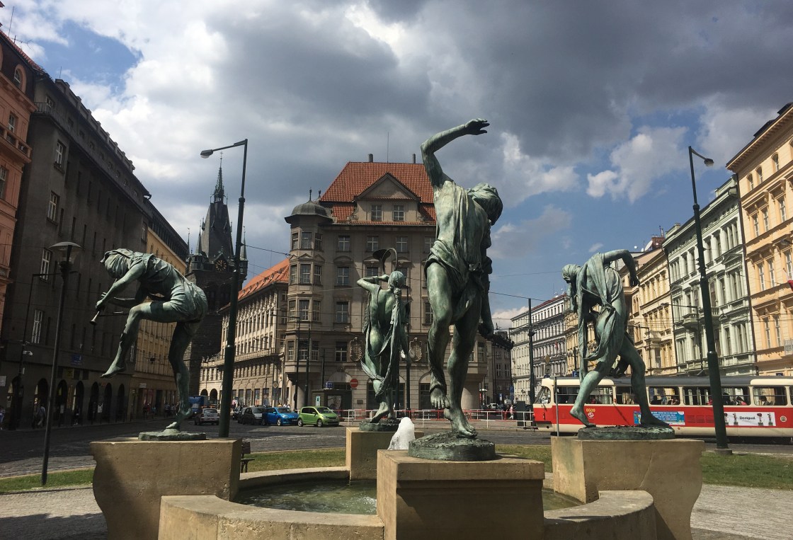 - DANCING FOUNTAIN CZECH MUSICIANS– located on a small cement peninsula south of Henry’s Bell Tower in Nove Mesto, this beautiful fountain features four bronze figures, each blindfolded and holding an instrument. “Each musician represents the world’s main rivers: Indian Gang with the mandolin, South American Amazon with the flute, Danube with the violin and Mississippi with the trumpet.”[3] There’s a fifth figure, not part of the fountain a few steps away who’s trying to free himself and he represents the Nile. The artist is Czech sculptor, Anna Chromy. The movement and fluidity expressed in these figures are absolutely beautiful.